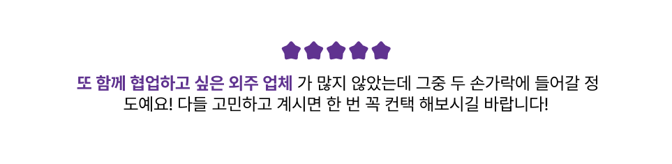 만족도 최상! 관계자분들 모두 의뢰드린 저희 보다도 더 적극적이시고, 열정적이시고 진행 내내 진심이 느껴져 감동 받고 감사했습니다. 많이 배울 수 있는 기회이기도 했습니다. 모두 차분하시면서도 성격이 좋으시고 소통하기에 편해서 내적 친밀감까지 쌓아 가지고 온 협업이었습니다! '대표님께서 재밌으십니다 :) ㅎㅎ'적극 추전드립니다! 추후 지속적인 협업의 의지가 있어 저희 제품들도 두고 왔답니다~!