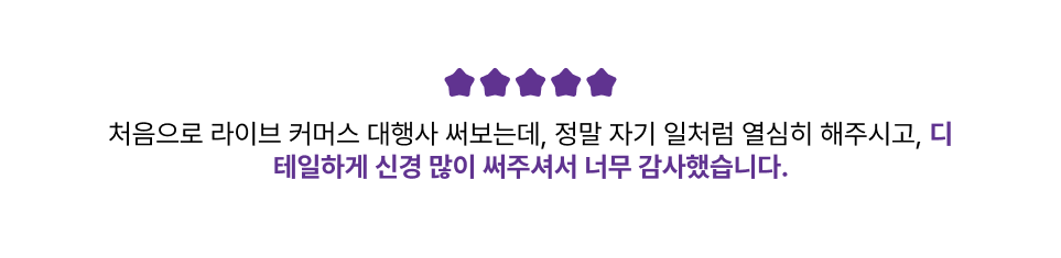 처음으로 라이브커머스 대행사 써보는데, 정말 자기 일처럼 열심히 해주시고, 디테일하게 신경 많이 써주셔서 너무 감사했습니다. 큰 틀에서만 먼저 공유 드려도 디테일하게 기획해 주시고, 컨택해 주신 쇼호스트 분들도 너무 좋았고 감사했습니다! 또 함께 협업하고 싶은 외주 업체 가 많지 않았는데 그 중 두 손가락에 들어갈 정도에요! 다들 고민하고 계시면 한번 꼭 컨택해 보시길 바랍니다!